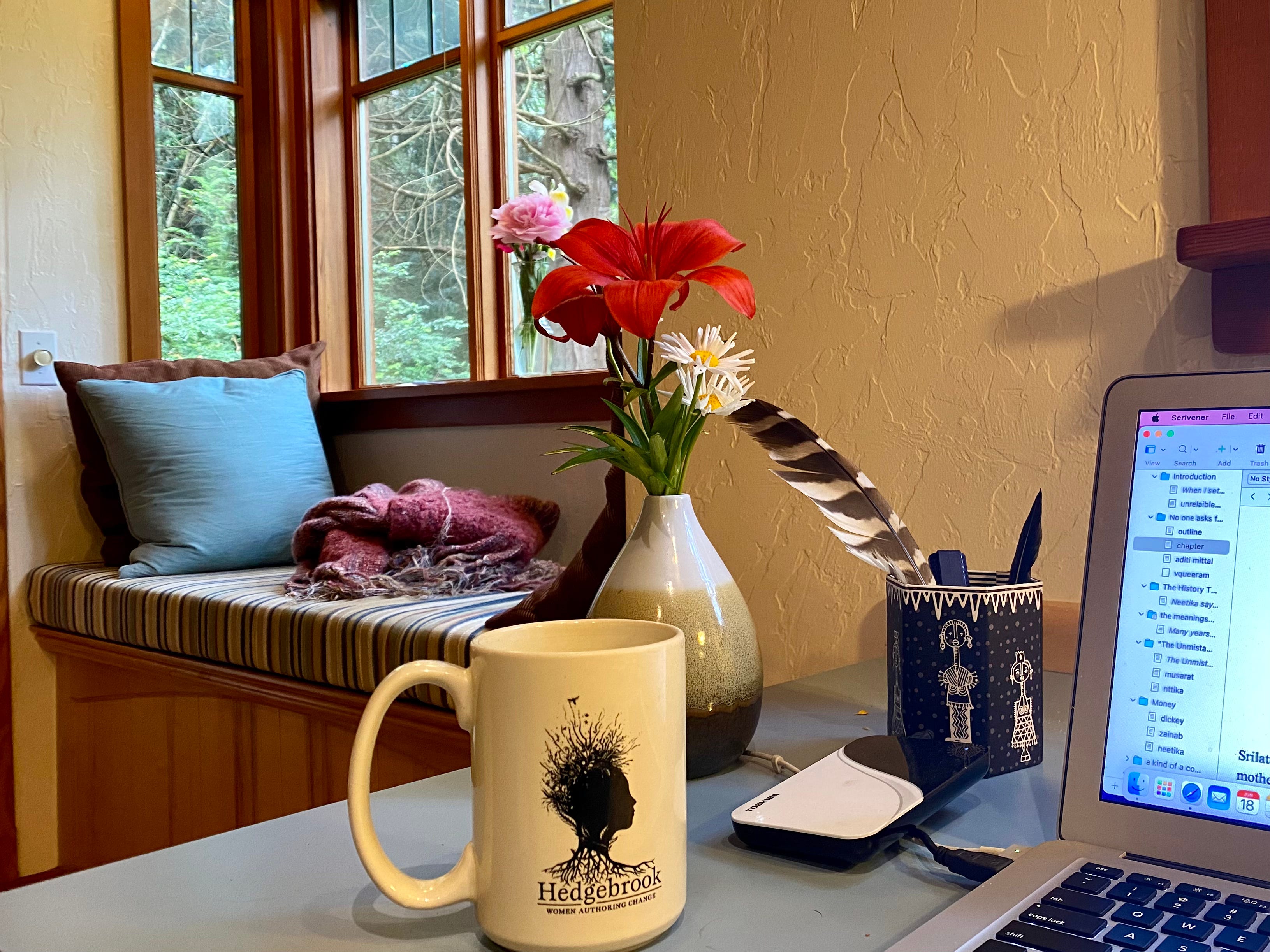 Hedgebrook did not disappoint. My four weeks in Willow Cottage, tucked away from the world, and free to fully inhabit my body and my words, were the most nurturing experience I have ever had, by far. Some of it was in the gourmet meals prepared around all our dietary restrictions. Some of it was in the great care they were taking to keep everyone safe during the pandemic. Some of it was in the wood always chopped and ready for our stoves, the flowers we were encouraged to pick for our vases, the warm smiles and deep conversations that always seemed readily available. But I kept trying to dig deeper, understand a little more of why that place made me feel safe enough to write and to read with abandon, to fully inhabit my present self and dress I had barely dared to dream before. I needed to understand this because I needed to know how to recreate it, for myself, and also for others in the future.