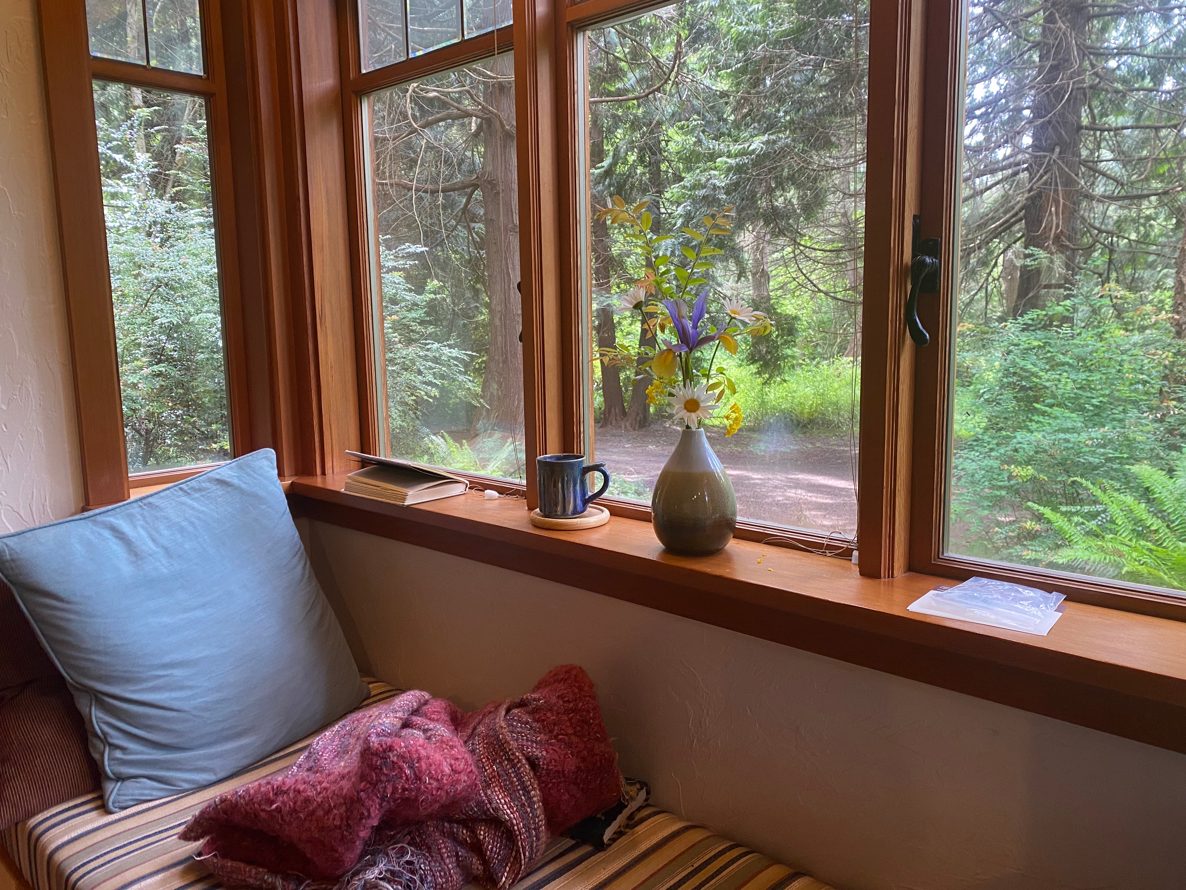 At Hedgebrook this year, I was delighted to learn that every cottage is equipped with a sleeping loft, a desk, an overstuffed armchair by the fireplace and a huge window seat. I felt so seen! I spent the better part of my residency curled up in this window seat, reading, writing, sipping tea, and just staring at those gorgeous pine trees outside, sometimes finding a big barned owl staring back! I decorated the ledge by my window seat with flowers and sand dollars, and it became my truest home in the cabin.